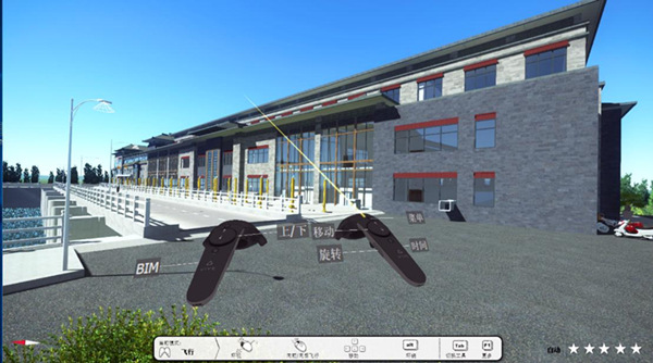 VR技術(shù)利用建筑物及設(shè)備的三維模型再現(xiàn)工程場景,使用者佩戴VR頭盔后將置身于三維場景中,觀察到立體景觀的同時,可以與場景實時交互,達(dá)到身臨其境的效果。這種沉浸式的VR體驗是有效的可視化溝通工具,把二維設(shè)計方案轉(zhuǎn)換成更容易理解的形式,呈現(xiàn)近乎真實的設(shè)計方案,為業(yè)主、設(shè)計單位和審查單位提供可視化的技術(shù)支撐。