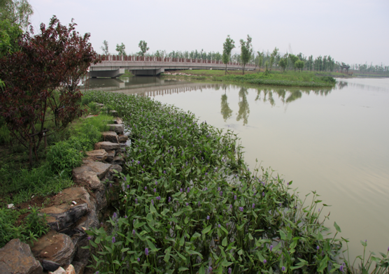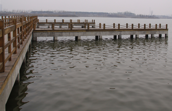 北部濕地觀光區(qū)緊鄰淮海大道主入口處,跨濕地小島建設(shè)一座景觀長橋。環(huán)湖親水步游道寬